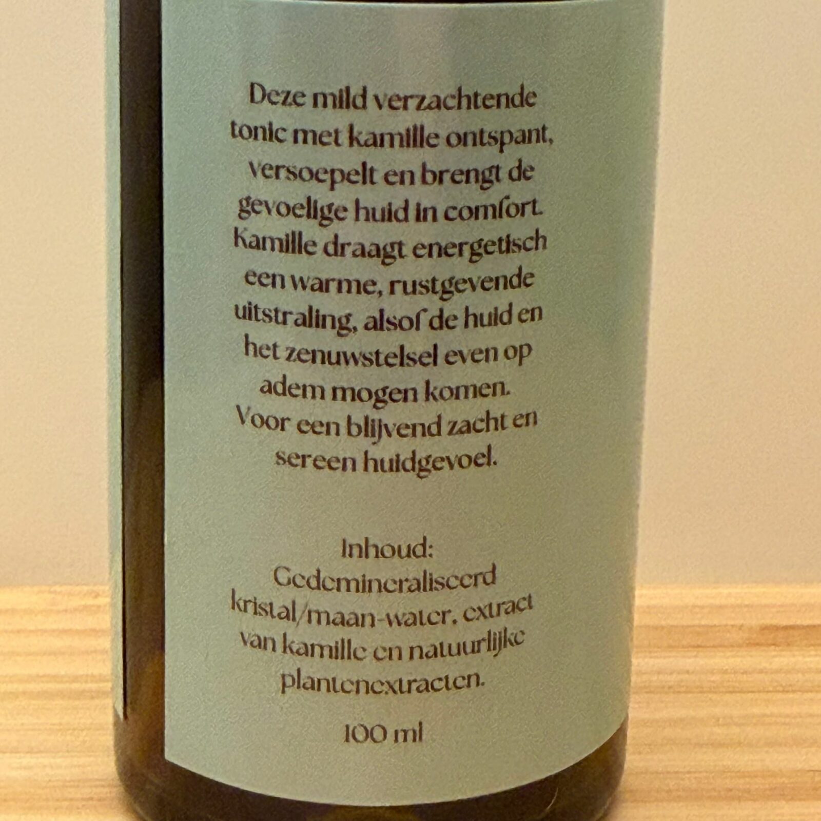Kamille Verzachtende Huidtonic is volledig plantaardig samengesteld en bevat gedemineraliseerd kristal/maanwater, kamille-extract en biologische plantaardige olie. De formule is vrij van onnodige synthetische toevoegingen en geschikt voor vrijwel alle huidtypen, maar in het bijzonder voor de gevoelige, droge en rode huid.