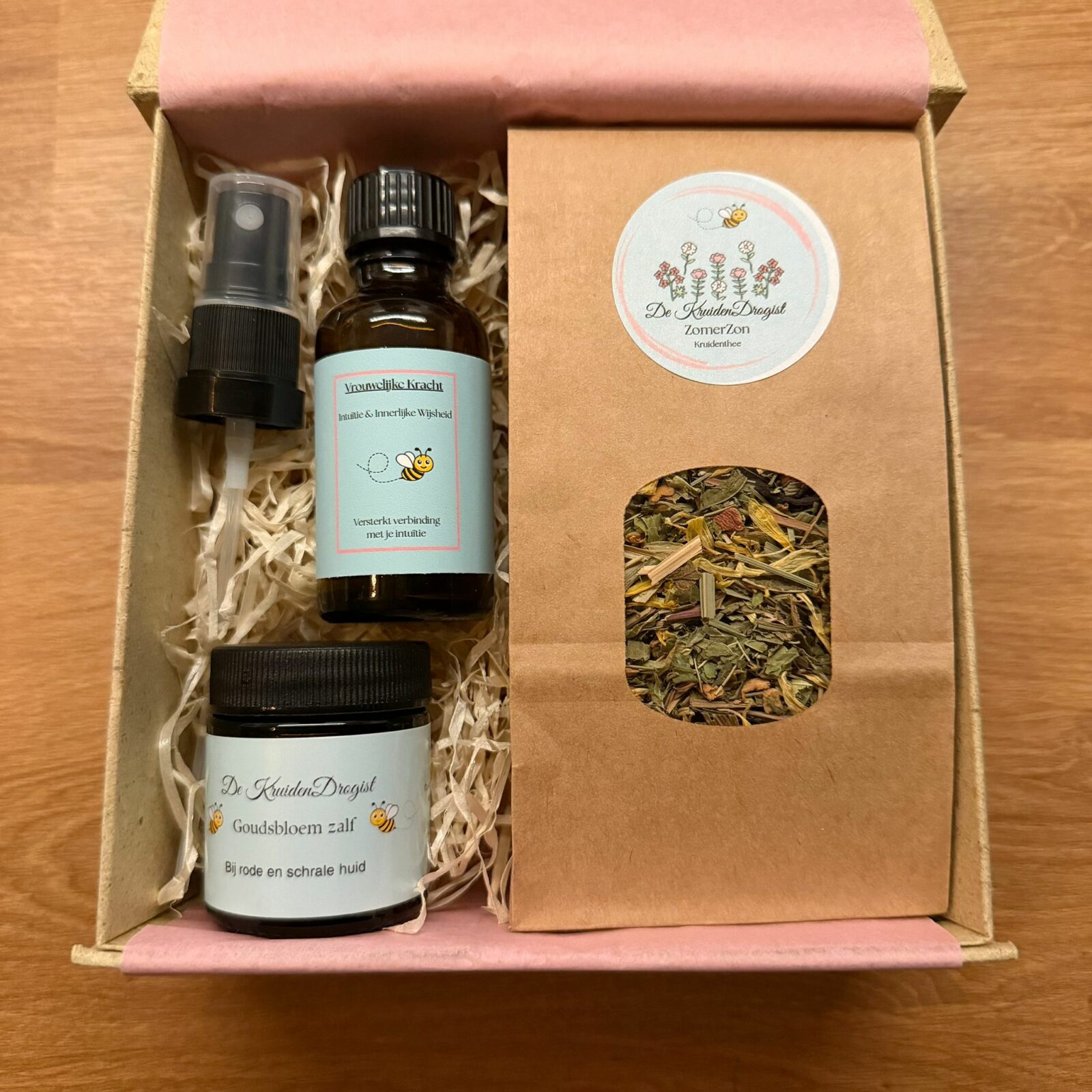 De Stralende Huid giftset is een warme, zonnige giftbox voor verzorging van binnen en buiten. Ideaal voor droge, gevoelige of beschadigde huid, maar ook voor iedereen die innerlijke kracht, warmte en licht wil omarmen. Goudsbloem, frankincense en zomerse kruiden vormen samen een helend, opbeurend ritueel dat straalt van zachtheid.