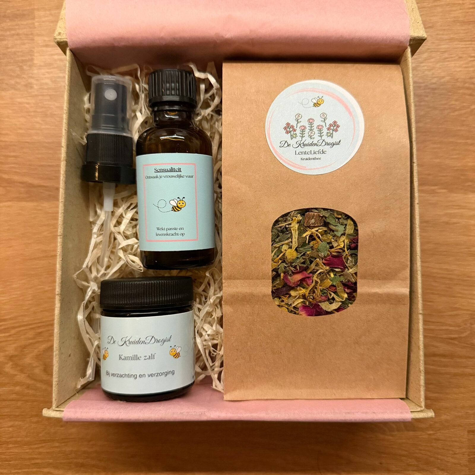 De kruidenthee LenteLiefde maakt deze set helemaal compleet. Met rozenblaadjes, frambozenblad, citroenmelisse, kamille en goudsbloem is het een zachte, bloemige melange vol tederheid. Het is een thee die het hart verwarmt, spanning vermindert en een vleugje lente brengt — zelfs op grijze dagen.