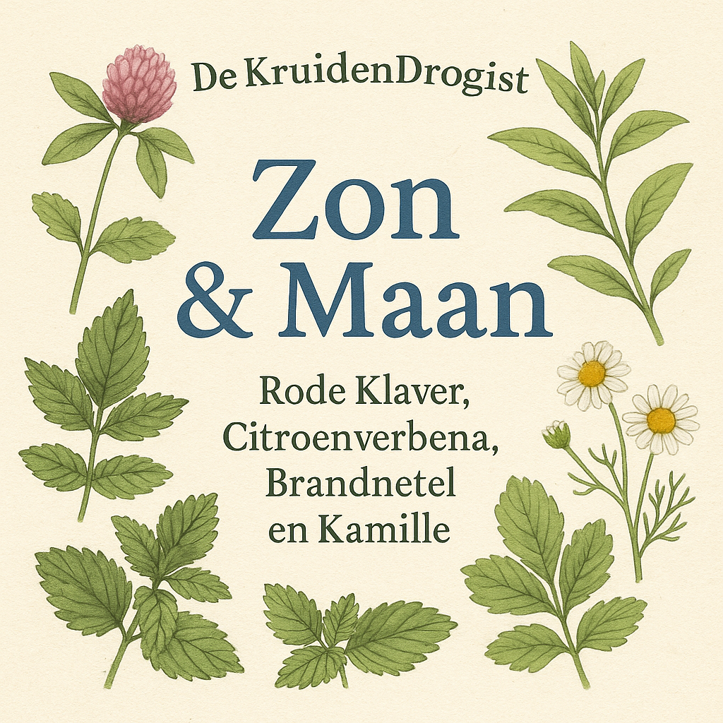 De zorgvuldig geselecteerde kruiden rode klaver, citroenverbena, brandnetel en kamille werken in synergie om het lichaam te voeden, de hormoonhuishouding te ondersteunen en de geest tot rust te brengen. Zon & Maan nodigt uit tot een moment van balans: de levenskracht van de zon gecombineerd met de kalmerende zachtheid van de maan.